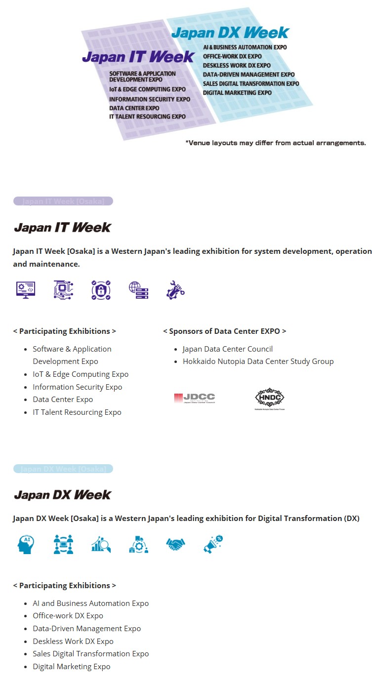 박람회안내 | 오사카 IT 박람회[JAPAN IT WEEK OSAKA 2025]가 2025년 11월 19일부터 21일까지 3일간 일본 오사카 INTEX OSAKA에서 개최됩니다. 이에 참관단을 모집하오니 관련 업체 분들의 많은 관심과 참여 바랍니다. ◈2025년도부터 바뀐 JAPAN IT WEEK ![]() |